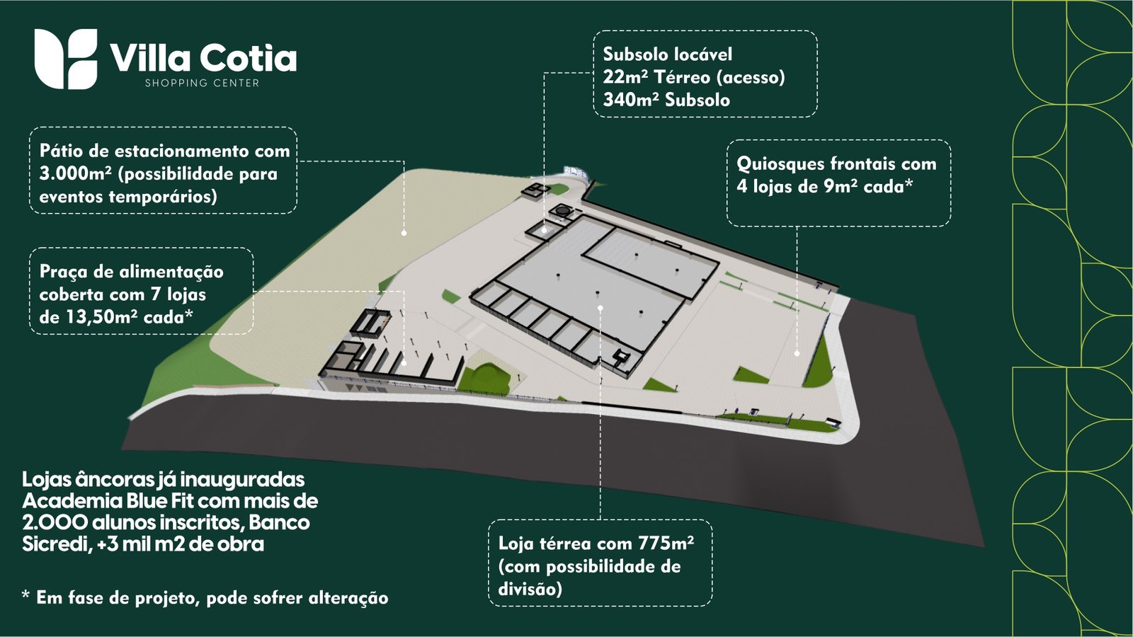 Período: ativações temporáriasEstacionamento no pátio 02;Tamanho: 3.000 m² – Eventos, Shows, Outlets temporários. Cinema ao ar livre.